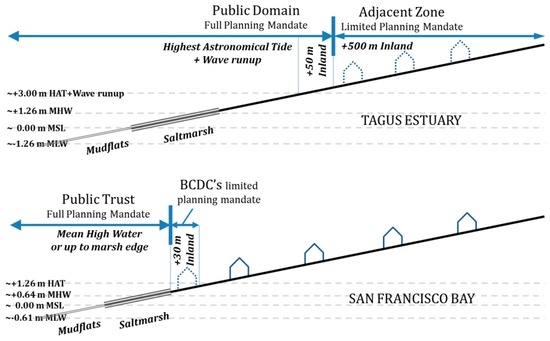 In the last three decades, environmental law has been refined and expanded to increase the level of protection granted to natural systems. Wetlands and all floodplains have been explicitly protected under the National Ecological Reserve since 1983 [100], but coastal wetlands were, by definition, already included in the Public Domain. Further expansion of the protective buffer inland from the domanial waters came with the Water Law of 2005 [63] which matured from earlier legislation the concept of “adjacent zones” in flood-prone or sensitive areas, extending a limited planning mandate over all land considered as vulnerable to flooding from river or sea waters. In the specific instance of waters under tidal influence, as is the case with the Tagus Estuary, the effects of wave run-up are also to be considered as forcing factors when defining the “highest astronomical tide line” (HAT) that serves as the upper limit for the “bed” (Figure 5). In the case of the Tagus Estuary, the Governmental Decree authorizing the Environmental Agency to produce the new Estuary Management Plan [3], also established (according to the concept of “adjacent zones”) a planning mandate for a 500 m transition zone inland from the upper limit of the Public Domain, in addition to the 50 m-wide “margin”. Furthermore, the national law [63] establishes that “land lost to the sea” through erosion is to be automatically incorporated into the Public Domain, and the adjoining buffers realigned according to the new shoreline.