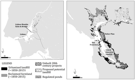 Urbanized landfill, reclaimed farmland, and cancelled projects (between ~1850 and ~2000) in the Tagus Estuary and San Francisco Bay.
