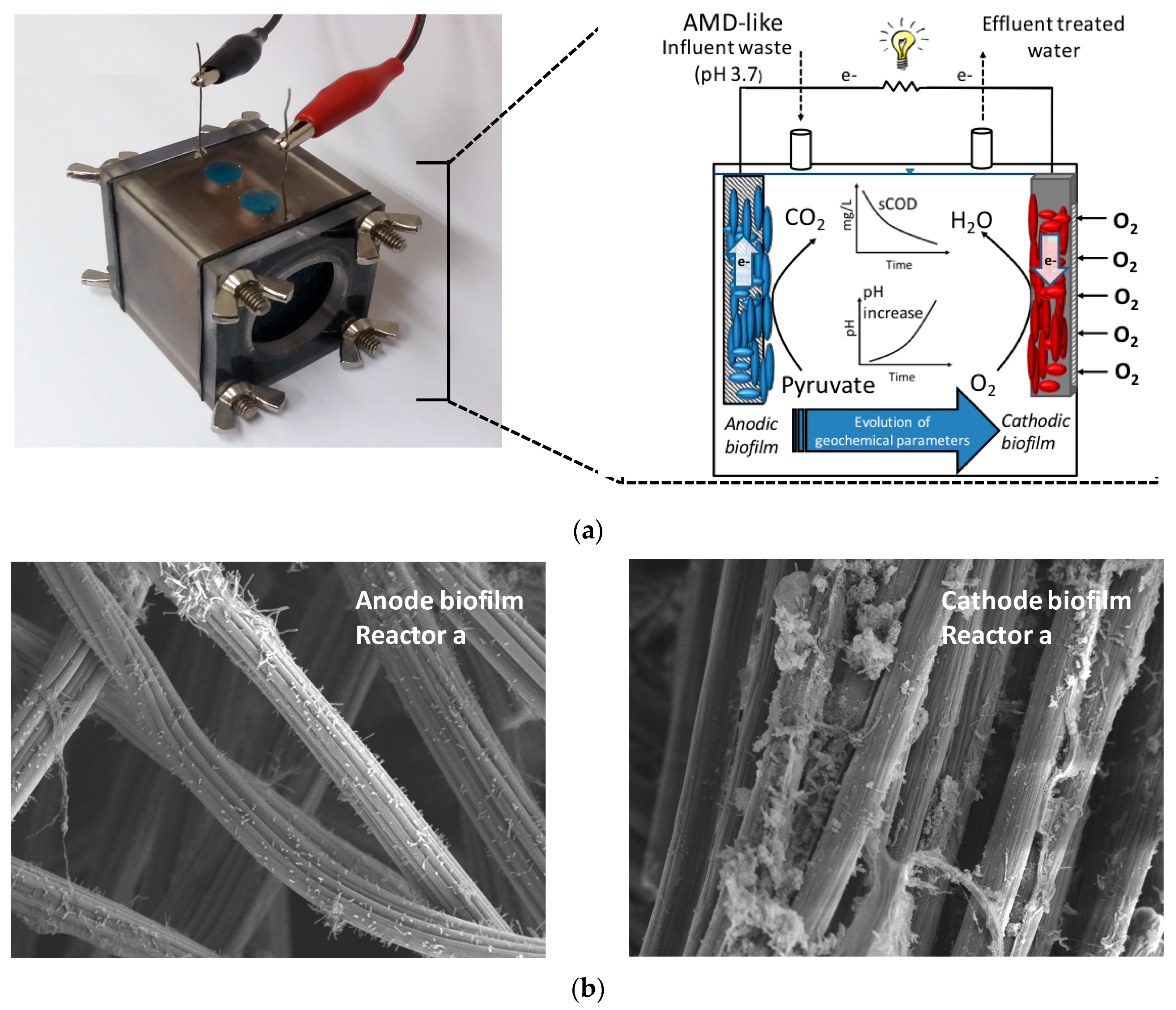 Acid mine drainage (AMD) is a worldwide environmental concern that produces acidic waters (pH < 4) with high metals and sulfate concentrations that pose a serious pollution threat to surface and ground waters [1]. Therefore, AMD treatment has been one of the major focus of study in recent decades [2,3,4,5]. Unfortunately, conventional treatment technologies for AMD remediation have several limitations, both economic and operational [6]. Nevertheless, new bioremediation systems based on microbial fuel cells (MFC) might appear as a new and sustainable alternative [7,8].
