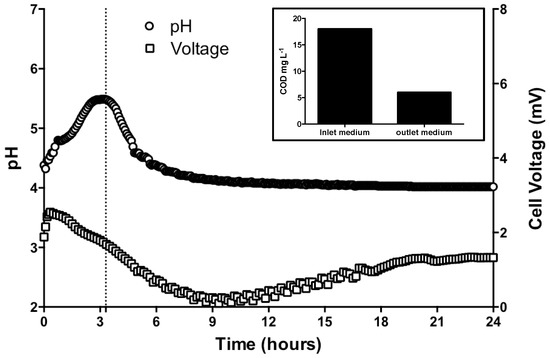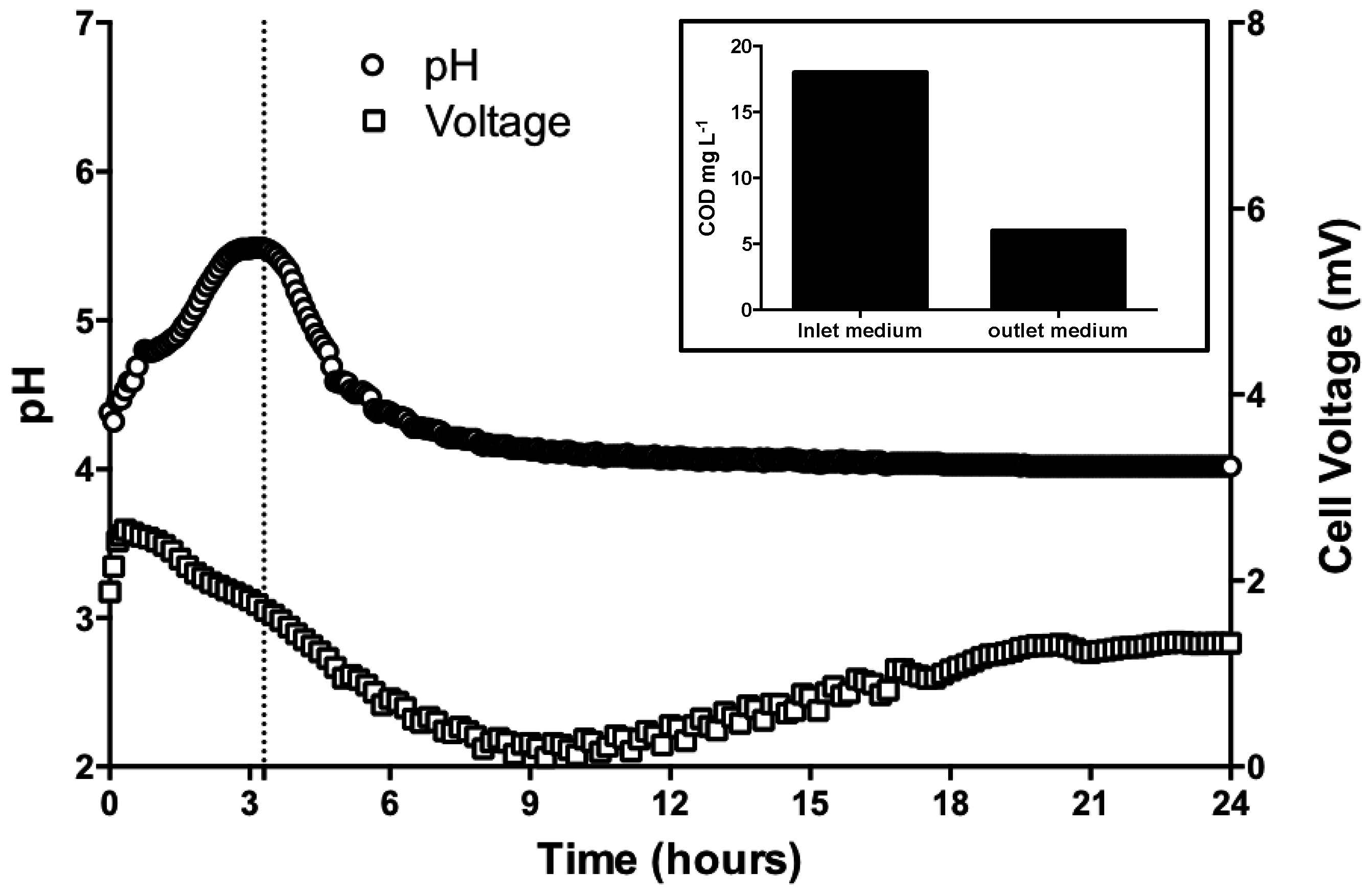 For all the experiments, the corresponding effluent was collected for pH measurement, every 15 min. Additionally, cell voltage was registered every 10 min (100 Ω external resistor), and sCOD was measured at the beginning and the end of the experiments.