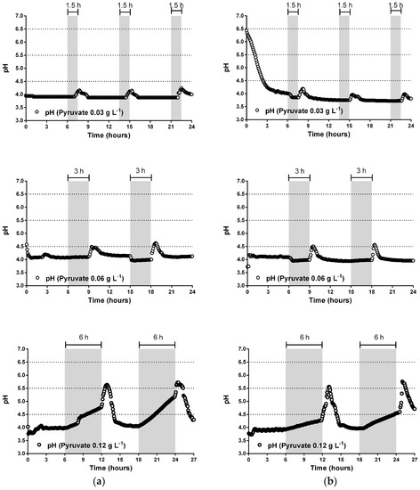 pH neutralization in experiments with alternated batch and continuous-flow operation mode under (a) closed-circuit conditions (100 Ω resistor) and (b) open-circuit conditions. The experiment was performed with different concentrations of electron donor (pyruvate). Batch-periods are shown by grey stripes (1.5, 3.0, and 6.0 h). Data sets are representative of multiple replicates of each run.