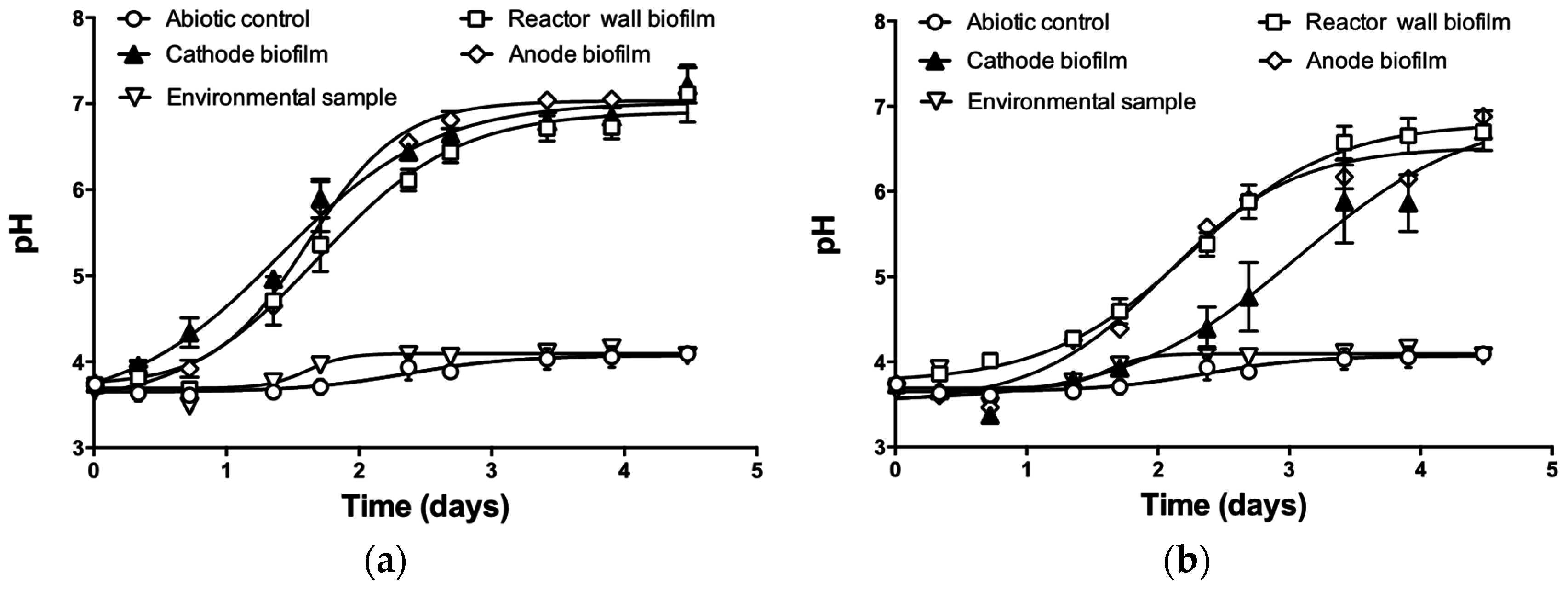 pH evolution in batch cultures of microorganisms present at electrodes and reactor walls from reactor “a” (a) and reactor “b” (b). Biofilms were used as inocula for cultures under initial acidic conditions (pH = 3.7, 1.3 g·L−1 Pyruvate). Batch experiments were performed at room temperature (~20 °C), with an initial cell concentration of ~5.5 × 108 cells·mL−1. The data are presented as mean ± SD (error bars) (n = 2). Abiotic control and environmental sample culture were also included in the experiment.