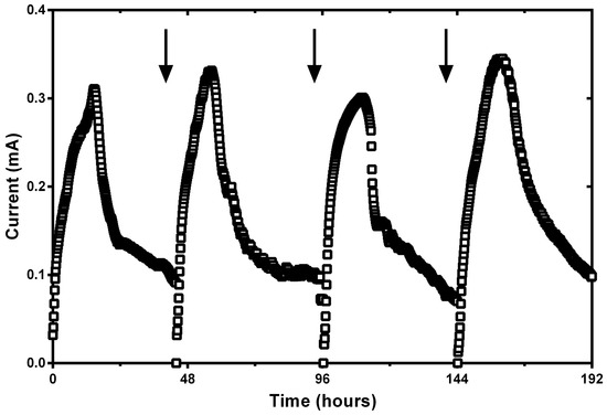 Current generation during batch operation. Typical shape is observed for the current behavior, which reaches a peak and then descend gradually over every cycle. Culture medium replenishments (1.3 g·L−1 Pyruvate, pH = 3.7 ± 0.1) are shown by the arrows. The data set shows four current cycles representative of the entire operation period.