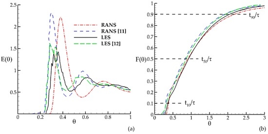 where is the injection period (t = 2.5 s) for the pulse injection, is tracer pulse at the inlet , is theoretical mean residence time of the tank (, where is the volume of the contact tank and is the volumetric flow rate), which is calculated as 109.2 s for the present contact tank volume and discharge based on the assumption of plug flow in the contact system, and is the dimensionless time. Normalized tracer RTD at the outlet of the contact tank is monitored during the simulation and compared with the numerical results reported in the literature [7,12] for validation. A comparison of both RANS and LES cases are shown in Figure 1, where t50 is the time required for 50% of the cumulative normalized tracer concentration to be observed at the outlet of the contactor.