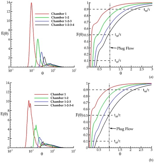 The RTD analysis of the tracer is performed at the end of each chamber, as well as inside the chambers using the volumetric efficiency definitions given below.