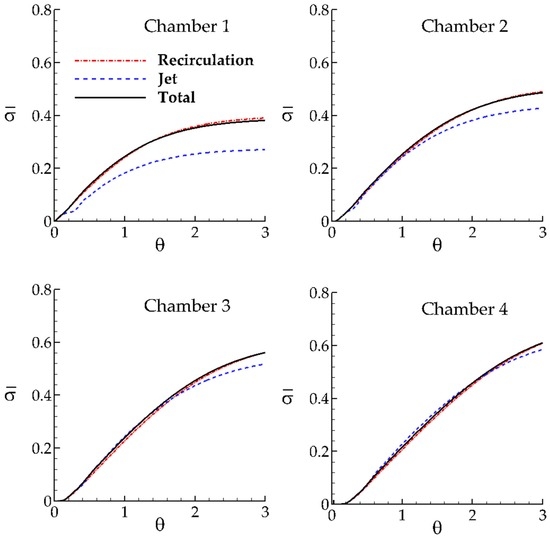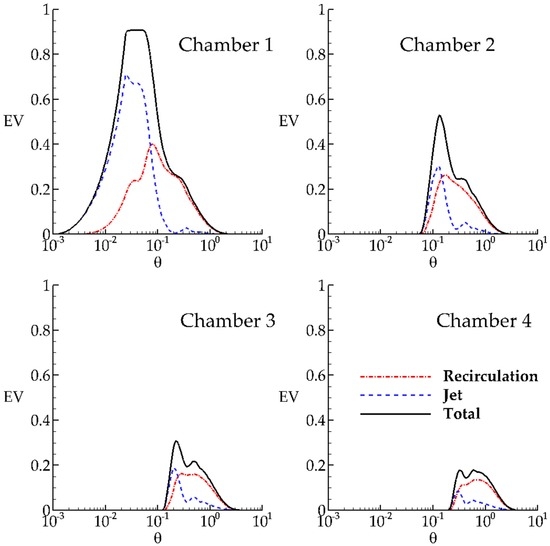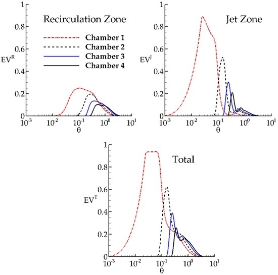 Dispersion index for the recirculation zone, jet zone and the total chamber can be calculated from Equation (3). The mean residence time is calculated from the following volumetric definitions for the recirculation zone, jet zone and the total chamber: