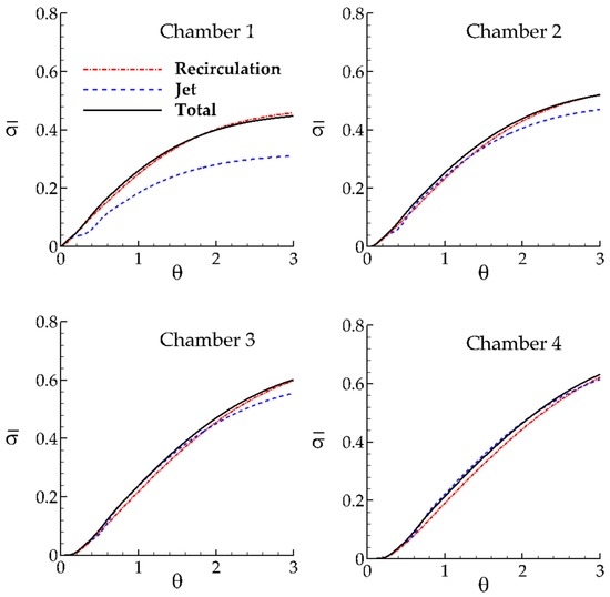 It is important to note that in Figure 4 we are looking inside the chambers from a Eulerian viewpoint since the volumetric indexes for jet, recirculation and total chamber (Equations (6)–(8)) are computed inside the chamber after zone separation [1]. In Figure 4, one can see the time variation of tracer concentration that enters to the chamber and leaves the chamber and the interaction of each zone. It is clear from Figure 4 that all zones are active zones that contribute to mixing.