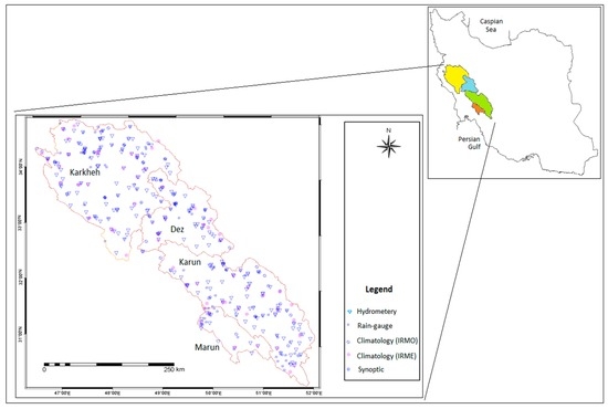 The Zagros Mountains are one of the major snowy regions of Iran, which include the four large river basins of Karkheh, Dez, Karun and Marun. The study area encompasses the Karkheh basin, upstream of Karkheh Dam, with approximately 43,000 km2 in area and 5.2 km3 mean annual runoff; Dez Basin, upstream of Dez Dam with 17,300 km2 in area and 8.4 km3 mean annual runoff; Karun basin, upstream of Gotvand Dam with 32,000 km2 in area and 12.5 km3 mean annual runoff; and two tributaries of the Marun basin, first upstream of Shohadaye Behbahan Dam and second upstream of Jarreh Dam with 6800 km2 in area and 2.3 km3 mean annual runoff, in total. The area lies between the geographical latitude of 30°15′ N to 34°55′ N and 46°05′ E to 52°03′ E longitude. The mentioned river basins play a major role in food production and economy of more than 4 million people [10,11]. Figure 1 shows the location of these major river basins.