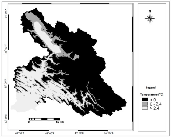 Isothermal maps are developed using the digital elevation model (DEM) and the temperature gradient relationships. The average threshold temperature is 2.4 °C at most synoptic stations, which is assigned as the threshold for the entire region (more explanation is available in Saghafian et al. [16]). The area with average monthly temperature less than 2.4 °C are designated as the potential snowfall areas and areas with temperature below 0 °C are classified as the potential area for snow persistence. Therefore, the regions with temperature between 0 °C and 2.4 °C represent areas prone to coupled snowfall-snowmelt processes. Figure 3 illustrates the spatial distribution of potential snowfall, snowmelt, and snow persistence areas in February in Dez Basin.