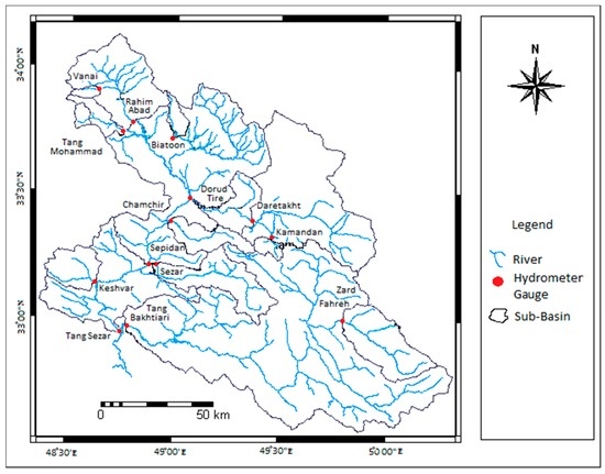 Snowmelt runoff volumes at 40 hydrometric stations are calculated based on the water balance model. Figure 5 shows the location of the selected stations in Dez Basin and all the hydrometric stations are shown in Figure 1. A regional regression model between snowmelt runoff volume and the percent of basin area higher than 2500 m is then built in order to provide estimates of snowmelt runoff at sub-basin outlets without hydrometric station (more information is available in Ghanbarpour et al. [22]). Snowmelt runoff volume and the corresponding priority in Dez Basin are given in Table 1 as an example.