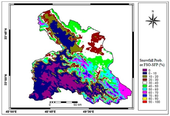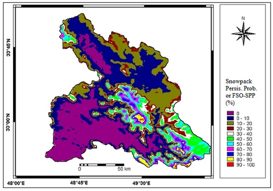 In this study FSO is calculated for two time periods of December–February and March–May. Since the study area receives snow from early December to late February [12], FSO during these months is considered as snowfall probability (FSO-SFP). Also, almost all snow storage of study area melts during March until end of May. Therefore, FSO during these months is considered as snowpack persistence probability (FSO-SPP). FSO-SPP is dependent on temperature, additional precipitation and topographic conditions of the land [24,25]. Snow may disappear quickly due to temperature increase and/or shallow depth of snow. Snowmelt and loss of snow storage occurs faster along southern aspects because of direct sunshine [24,25]. Since spring and summer are high water demand seasons in the study area, FSO-SPP or snowpack persistence is important for meeting the water demands.