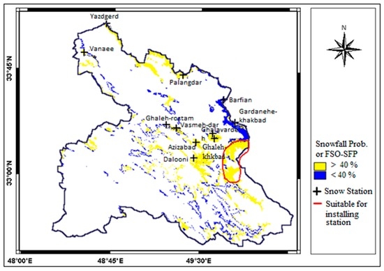 To make a final decision, the weighted average snowfall probability in this altitudinal range (rounded to 40%) is used as a criterion to determine the appropriate area for installing the stations. Thus, we set a threshold FSO-SFP of 40% to assess the present network. The selected zone for new stations is shown in Figure 8 along with the current station network. According to this figure, the existing network in this elevation has a desirable distribution, however, Ghaleh-rostam and Vazmeh-dar stations are close to each other and located at same elevation (2300 m). Therefore, one of the two stations should be removed. Vazmeh-dar station has more priority than Ghaleh-rostam station based on the FSO-SFP and FSO-SPP criteria, the ratio of winter precipitation to the annual precipitation, potential of snowfall, and road access. The two stations have similar contributions in snowmelt runoff according to the hydrological criteria. Therefore, Vazmeh-dar station is kept.