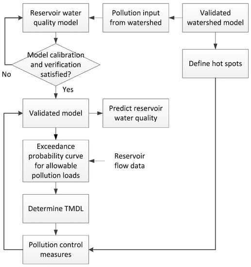 In this study, an exceedance probability method is used to establish reservoir TMDLs. The use of probability to illustrate water quality is not a new; for example, Havens and Walker [14] related total phosphorus (TP) concentrations to the occurrence probability of algae bloom and applied an empirical model to evaluate the level of protection of the waterbody from bloom occurrence under maximum allowable external TP loads. However, the use of exceedance probability for determining the TMDL of a reservoir has not been conducted previously. In addition to the novel evaluation of this method, a complete flowchart, including pollution source analysis, water quality modeling at the watershed and reservoir scales, the association of pollution sources with the resulting water quality, and pollution reduction strategies for hot spots are demonstrated in this study. This procedure is applied in a Taiwanese reservoir as a case study and is expected to be applicable in other cases.