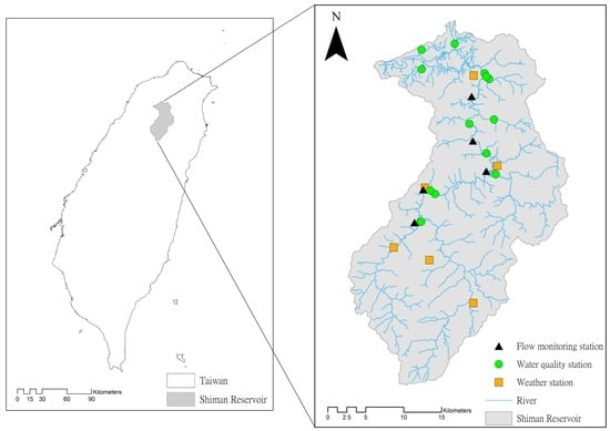 The Shiman Reservoir was constructed in 1964 and has a total water storage volume of 201.24 million m3, a water surface area of approximately 8 km2 and a watershed area of 736.4 km2. The Shiman Reservoir is a multiple-function reservoir that is used for drinking water, irrigation, electricity generation, flood control, and recreation. The reservoir provides drinking water for nearly 2 million people in Taoyuan City, Taiwan. It is located upstream of Dahan Creek in northern Taiwan (Figure 2). The elevation of the watershed ranges from 100 m to 3500 m; accordingly, the flow rate is high, and serious soil erosion occurs. In this reservoir, several efforts have been made to mitigate soil erosion and reduce the amount of sediment entering the reservoir. Previous reservoir management measures satisfactorily reduced the sediment in the reservoir. However, although the turbidity of the water was decreased, eutrophication continued to occur.