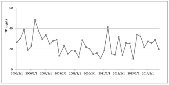 Total phosphorous (TP) concentrations in the Shiman Reservoir in 2005–2015. The standard TP concentration is 20 μg/L.