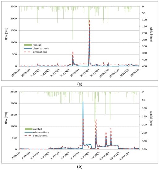 The flow simulation results. (a) The model calibration using the 2012 data; (b) the model validation using the 2013 data.