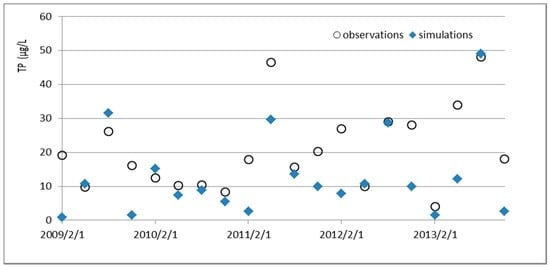 In the Vollenweider model, all equation parameters are denoted from realistic data except for the settling velocity (v), which differs among different reservoirs, and no experimental value for the Shiman Reservoir was obtained. Therefore, this parameter must be verified before it is applied. Observed TP concentrations were compared with the simulated TP concentrations to determine the appropriate v value. The input TP mass was obtained using verified SWMM. The input data used in the Vollenweider model are summarized in Table 2. The TP concentration in the reservoir was sampled each season for a total of four observations per year. Therefore, we used 5-year data to calibrate and verify the model (Figure 7). Consequently, the verified settling velocity for the Shiman Reservoir was 10 m/year.