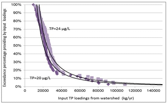 The required P concentration is 20 μg/L for the Shiman Reservoir. The allowable TP input mass at the fixed TP concentration of 20 μg/L is obtained using the previous 5 years of flow data, and its accumulative probability distribution is shown in Figure 8. In addition to the TP of 20 μg/L, a TP concentration of 24 μg/L is shown in the figure because a TP concentration greater than 24 μg/L is recognized as a eutrophic state based on the CTSI (Carlson Trophic State Index), which is officially used to represent eutrophication states in Taiwan. The allowable TP input mass at the exceedance probability of 50% means that the input mass could protect the reservoir by avoiding the TP concentration target at the probability level of 50%; we call this input mass M50. Therefore, M75 indicates that there is a 75% probability that this input mass could protect the reservoir and prevent TP concentrations greater than the target value. M90 provides a higher level of protection because the allowable input mass is more limited. The allowable TP input masses for different exceedance probabilities are listed in Table 3. We suggest that M50 can be used as the TMDL of the reservoir as a short-term strategy and that M75 or M90 can be used as a long-term strategy. The particular exceedance probability applied in any given case will depend on policy decision-making. For the Shiman Reservoir, the proposed allowable TP input mass is 22,209 kg/year (M50).