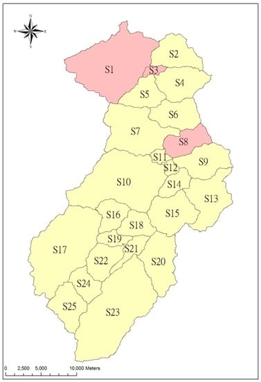 When determining the allowable TP input mass, the following procedure was used to allocate the input mass into the watershed and decrease the pollution content of the reservoir. Because it is a large watershed, the pollution hot spots in the reservoir are first defined as priority pollution control areas. The three following principles are used for defining these hot spots: the total contributed pollution loads, the percentages of point pollution sources, and the pollution load per land area. Of the 25 subwatersheds considered in this study, three subwatersheds were ranked as hot spots (Figure 9). The subwatersheds S1, S3, and S8 were characterized as areas of high pollution potential because they have high total pollution loads, a high percentage of point pollution sources, and high pollution loads per land area. At this stage, the subwatersheds with high potential pollution were identified. When detailing the sites and locations for best management practices (BMPs) and when determining load allocation, the advanced spatial optimization model might be needed, which includes cost-effectiveness and uncertainty considerations [22,23].