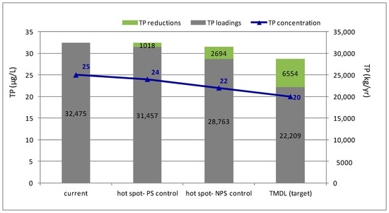 The current average TP concentration in the studied reservoir is 25 μg/L, and the current average TP input mass is 32,475 kg/year. If the target allowable TP input mass is 22,209 kg/year (M50), pollution should be reduced by 31.6%. Because the locations of the pollution hot spots have been defined, the required pollution reduction can be implemented in these areas first. The potential reduction of TP from point sources in the three hot spots is 1018 kg/year, and the potential reduction of TP from nonpoint sources is 2694 kg/year. The reduction of TP from point pollution sources could be achieved by improving domestic wastewater treatment. The reduction of TP from nonpoint sources could be achieved by using various BMPs, including structural and nonstructural measures. Therefore, controlling pollution at the three hot spots could decrease the TP from its current value of 25 μg/L to 22 μg/L. The TMDL and predicted TP concentration are shown in Figure 10. The control of hot spots can be regarded as a short-term management goal. If the goal of 20 μg/L is to be reached, pollution control measures must be implemented in the remaining subwatersheds.