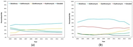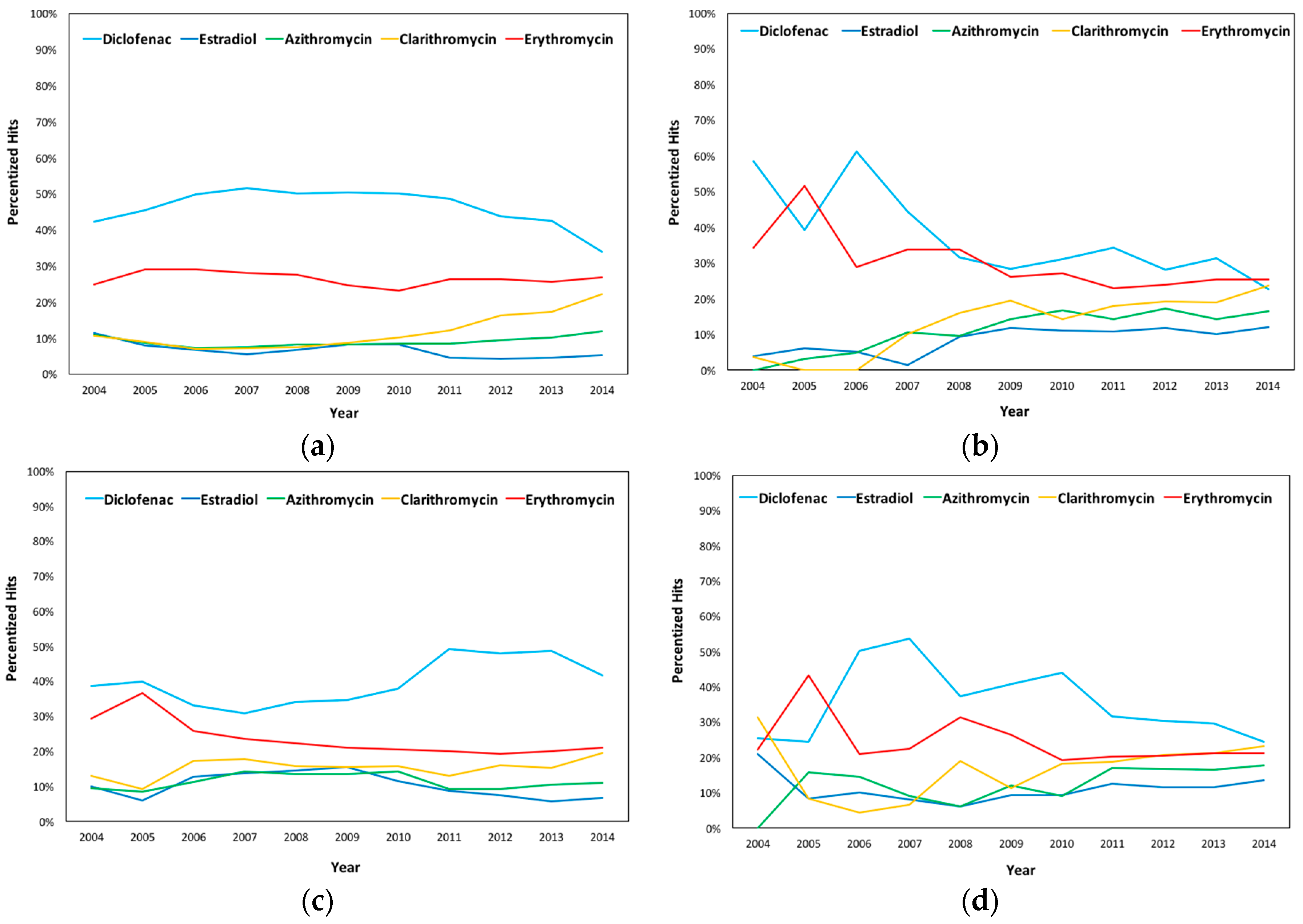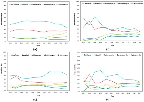 Yearly Averages of the Percentized Hits in (a) England; (b) Wales; (c) Scotland; and (d) Northern Ireland in Diclofenac, Estradiol, Azithromycin, Clarithromycin, and Erythromycin from 2004 to 2014.