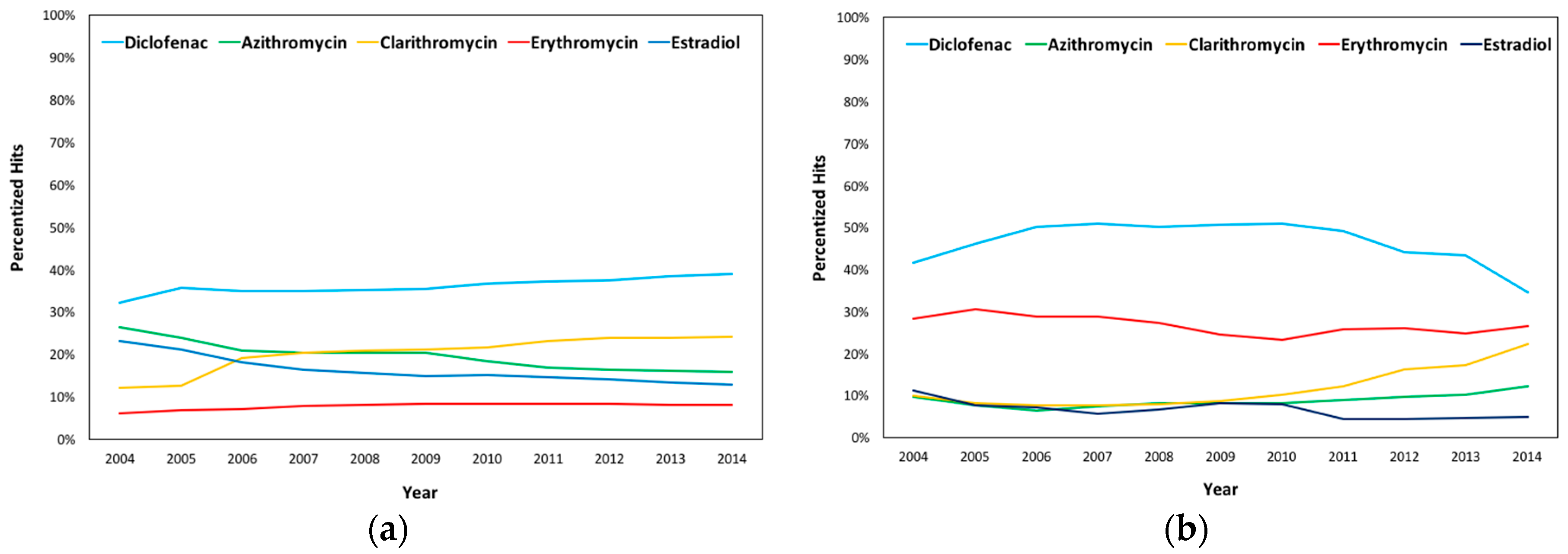 Figure 1 depicts the change in (a) the Worldwide and (b) UK’s yearly averages of the percentized hits for the terms ‘Diclofenac’, ‘Estradiol’, ‘Azithromycin’, ‘Clarithromycin’, and ‘Erythromycin’ from January 2004 to December 2014. Table 1 and Table 2 consist of the percentized hits’ yearly averages in these terms in the same period Worldwide and in the UK, respectively.