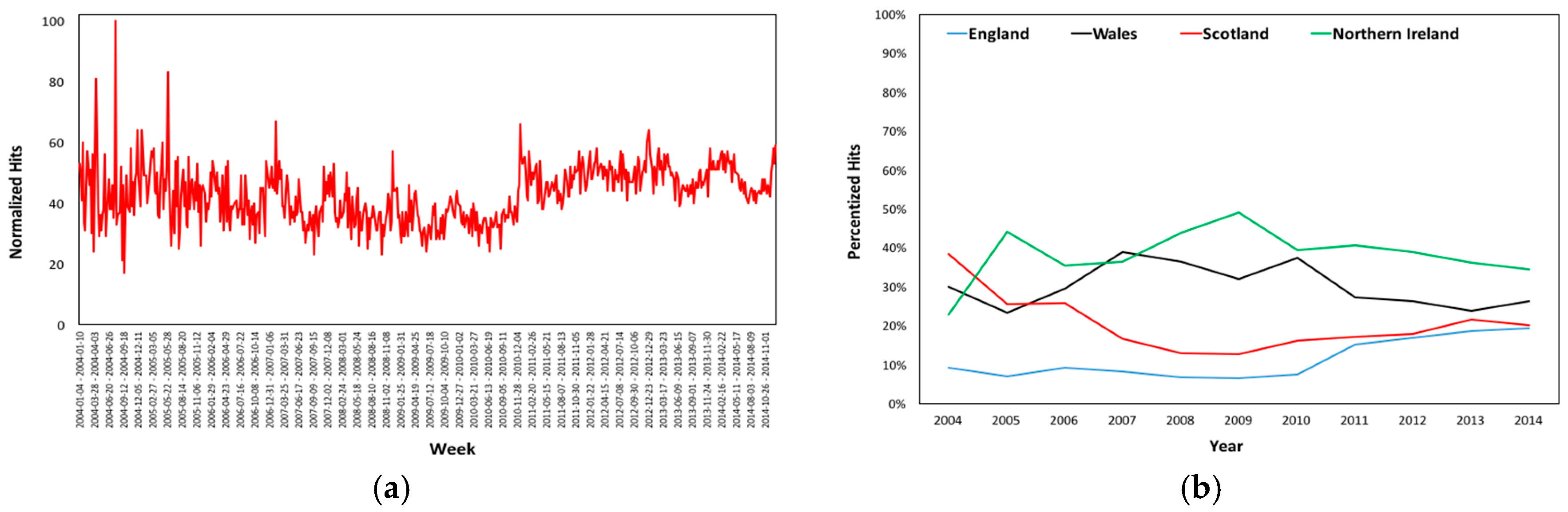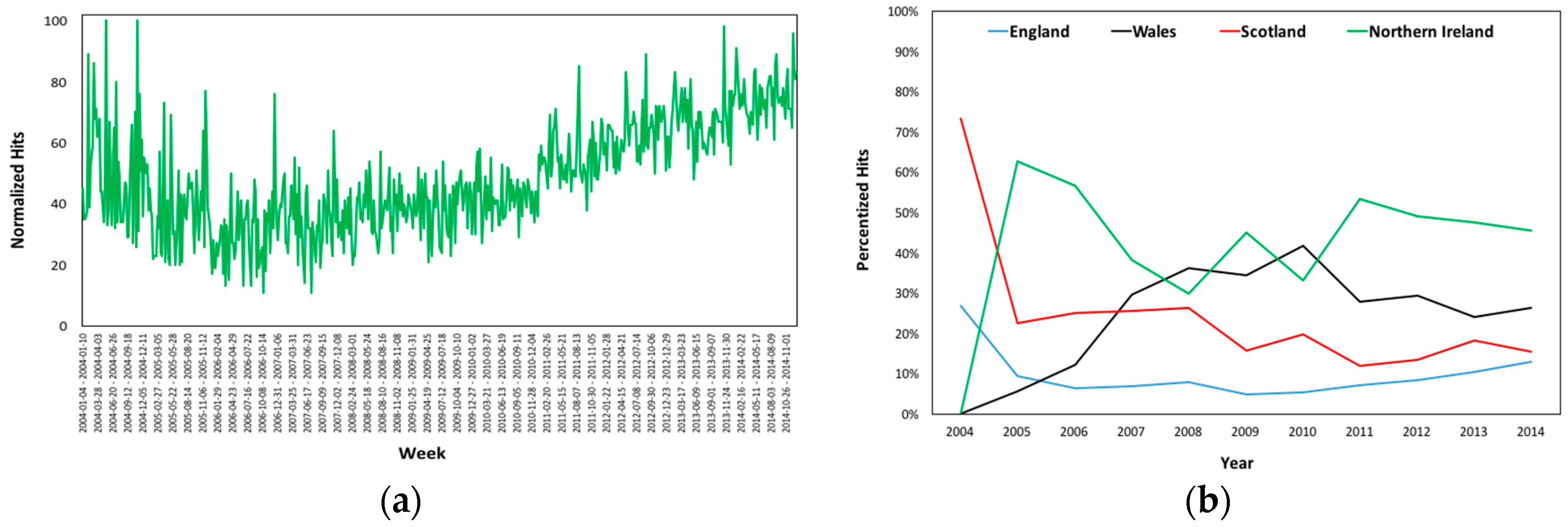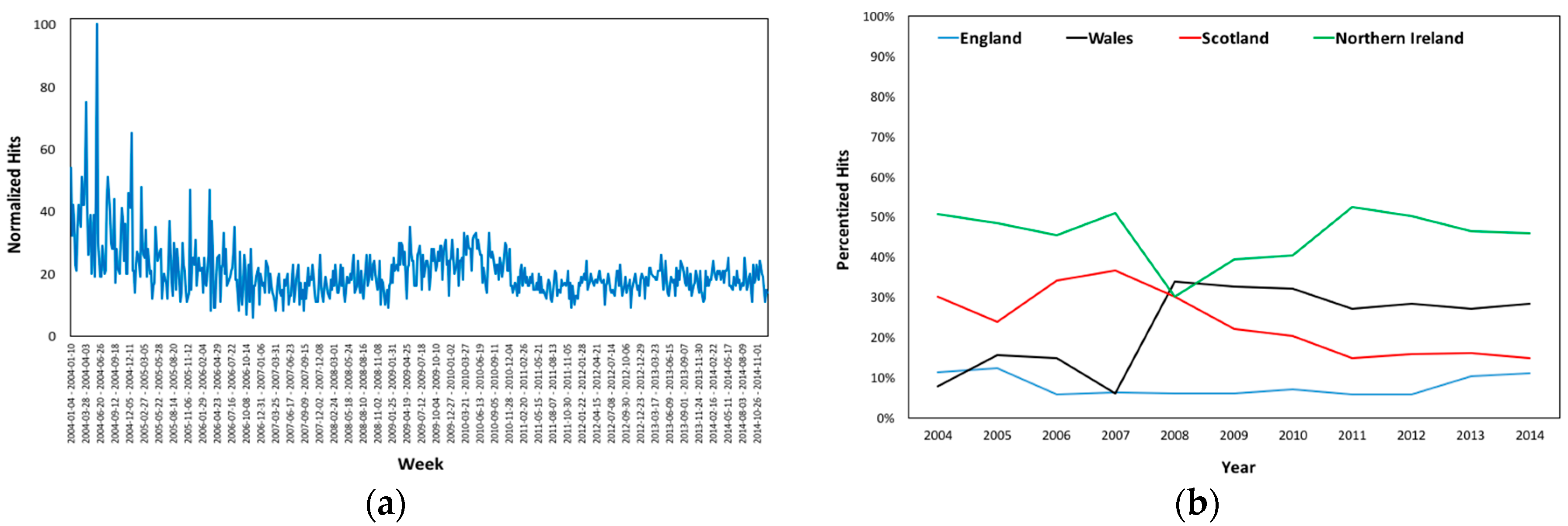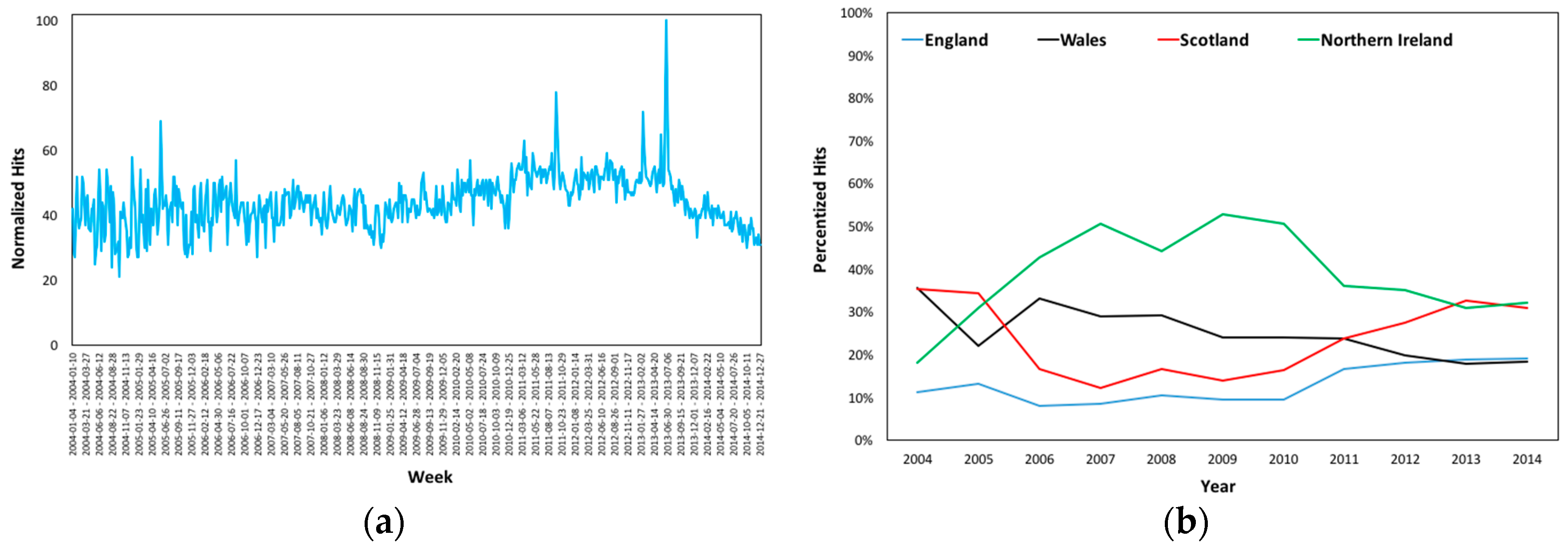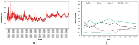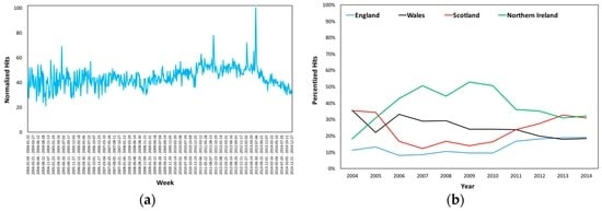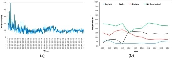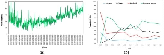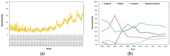 Estradiol’s (a) Normalized Hits in the UK and (b) Regional Percentized Hits Averages 2004–2014.