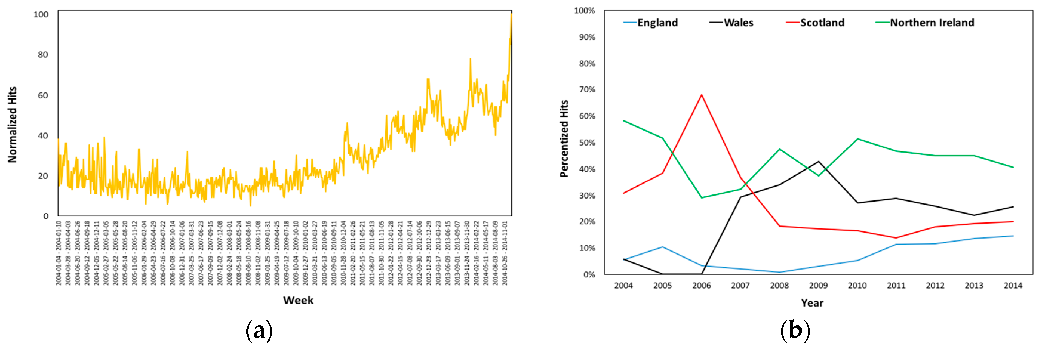 Yearly Averages of the (a) Worldwide and (b) UK Percentized Hits from 2004 to 2014.