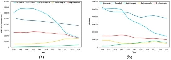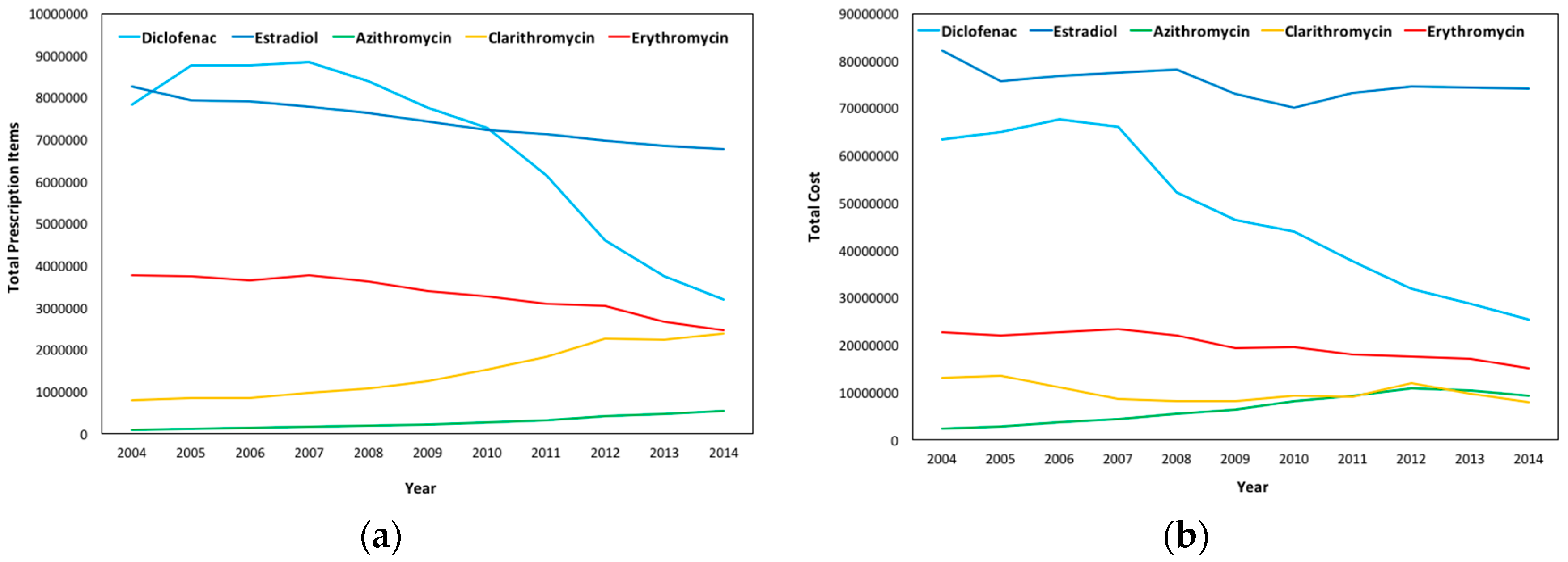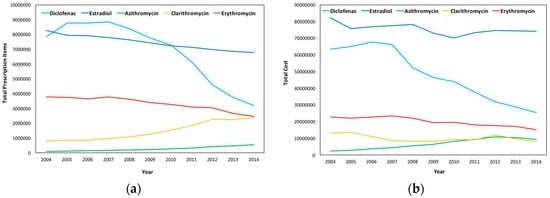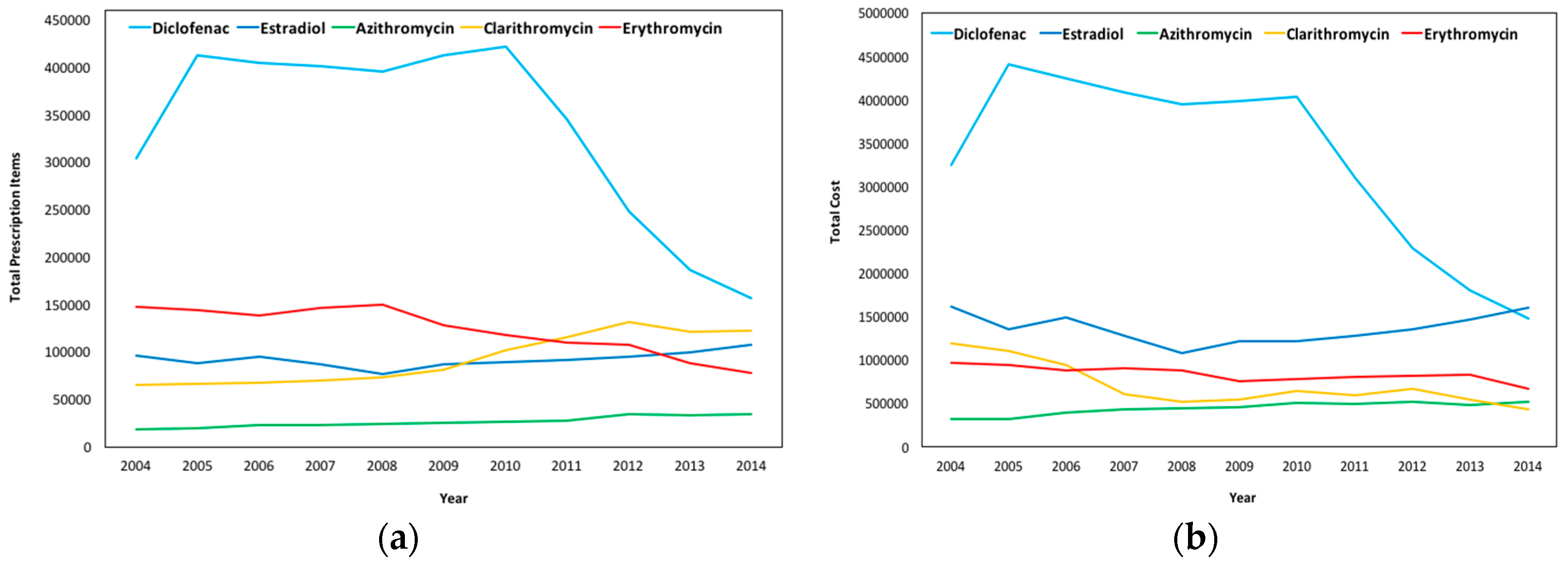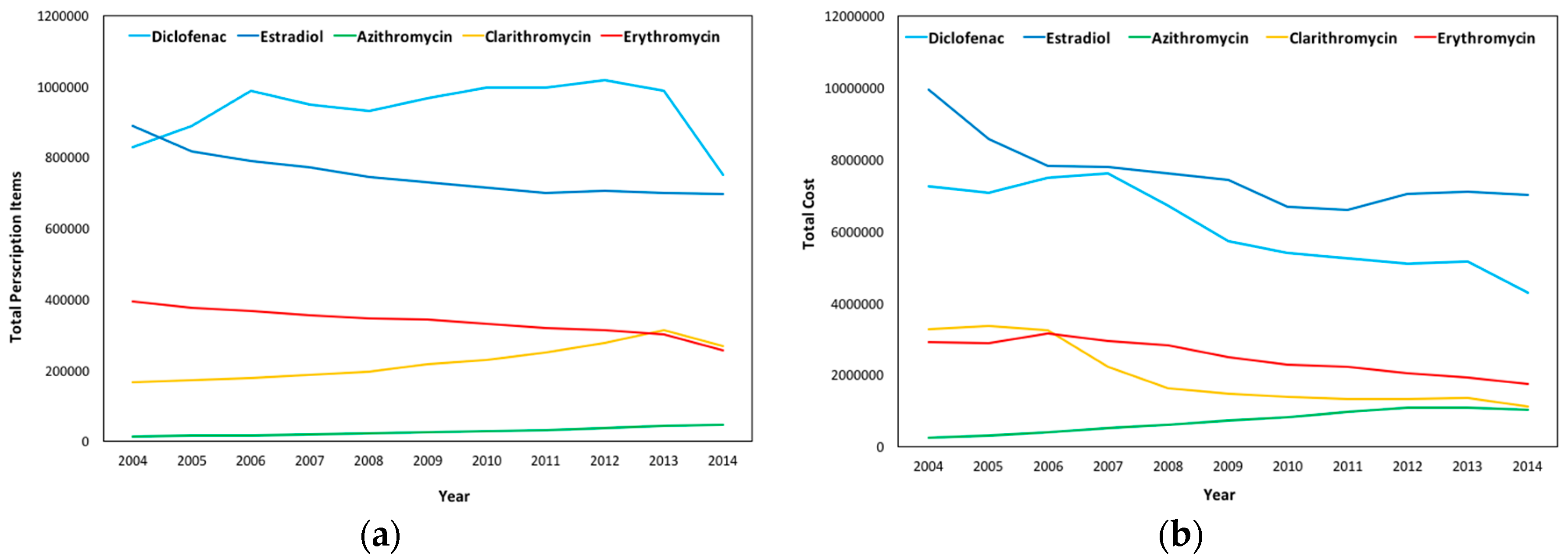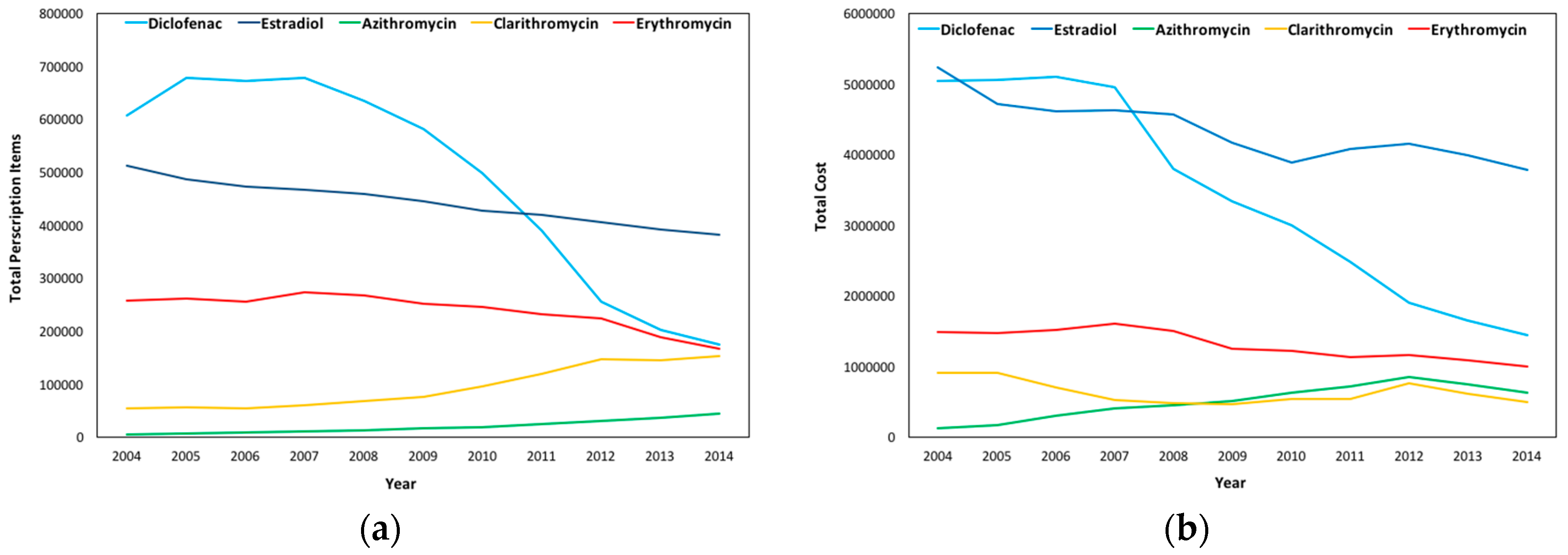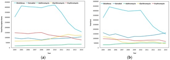 In Wales, a high decrease in issued prescriptions in Diclofenac and a significant decrease in Estradiol and Erythromycin are observed, while a slight increase in the number of prescriptions is observed for Clarithromycin and Azithromycin; a pattern similar to that of England. As demonstrated in Figure 9b, the total cost for the substances follows that of the number of prescriptions in Diclofenac, Estradiol, and Erythromycin, while for Azithromycin and Clarithromycin, though prescription items increased, the cost slightly decreased from 2012 to 2014.