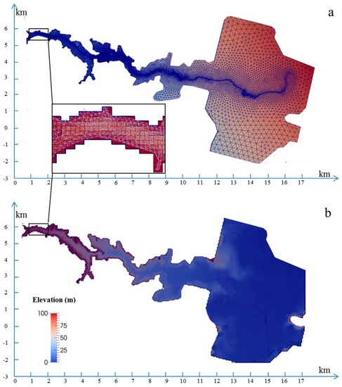 - Shi, Y.; Nguyen, K.D. A projection method-based model for dam- and dyke-break flows using an unstructured finite-volume technique: Applications to the Malpasset dam break (France) and to the flood diversion in the Red River Basin (Vietnam). Int. J. Numer. Methods Fluids 2008, 56, 1505–1512. [Google Scholar] [CrossRef]