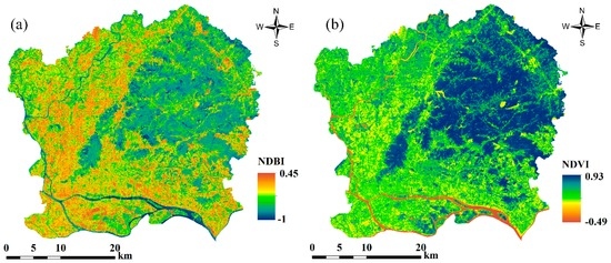 (a) Normalized Difference Built-up Index (NDBI); and (b) Normalized Difference Vegetation Index (NDVI) maps.