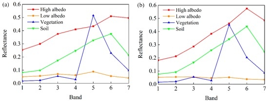 where i = 1, 2, …, m, m is the number of spectral bands, k = 1, 2, …, n, n is the number of endmembers, Ri is the spectral reflectance of band i of a mixed pixel, fk is a proportion of endmember k within the mixed pixel, Rik is the known spectral reflectance of endmember k within a mixed pixel of band i, and is the error of band i. The water body of the Landsat 8 OLI image is first masked by the Modified Normalized Difference Water Index (MNDWI) [50]. Four endmembers are then selected, including soil, vegetation, high-albedo, and low-albedo endmembers. The proportion fk of four endmembers is solved by the least square method with the following constraint:
