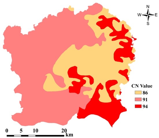 According to the hydrologic soil group and soil infiltration rate, the CN values of paddy and red soils were set to 94 and 86, respectively, and the CN values of deposited and aquic soil were set to 91. The CN map of soil types is then obtained and shown in Figure 9.