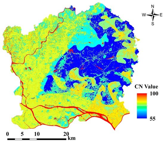 where the CN value is the main parameter of the SCS-CN model and is used to describe the relationship between precipitation and runoff. In this study, CN is estimated jointly by the fractions of impervious surface, vegetation, and soil [30]: