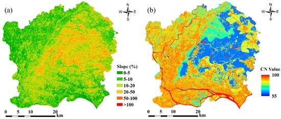 The Soil Conservation Service curve number (SCS-CN) was developed by the United States Department of Agriculture Natural Resources Conservation Service (NRCS) [4]. Because of its simplicity and operability, the SCS-CN model, with only a few data requirements [5], has been widely applied for surface runoff estimation [6,7,8,9,10]. Currently, the SCS-CN model has been integrated into many widely used hydrological models to simulate surface runoff, including the Soil and Water Assessment Tool (SWAT) [11], the Long-term Hydrologic Impact Assessment (L-THIA) [12], the Hydrologic Modeling System (HEC-HMS) [13], the Erosion Productivity Impact Calculator (EPIC) [14], and the Agricultural Non-point Source Pollution Model (AGNPS) [15]. Rejani et al. [16] used the SCS-CN model to estimate the daily runoff in a semi-arid microwatershed of Warangal district in Southern India in combination with Geographic Information System (GIS) data. Suribabu and Bhaskar [17] evaluated the urban growth effects on surface runoff by combining the SCS-CN and Green-Ampt infiltration models, which revealed that land cover/use change showed more significant impact for longer duration storms than shorter duration storms of the same magnitude. Yao et al. [3] selected the SCS-CN method to simulate the surface runoff potentials within different urban functional zones in Beijing with the aid of GIS and remote sensing (RS) technology. Kowalik and Walega [18] claimed that the errors in CN affect the surface runoff calculation to a much greater extent than errors in the storm rainfall. These works showed that the runoff curve number (CN) in the SCS-CN model is greatly affected by land use, soil conservation measures, land use cover, terrain slope, and antecedent moisture conditions [19,20].