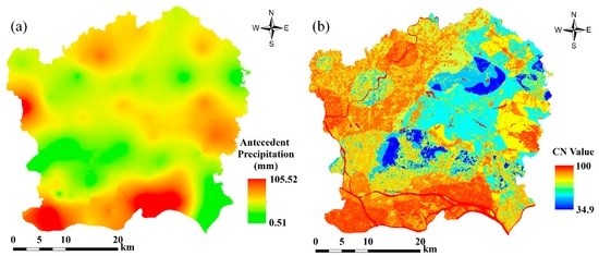 Map of the total 5-day antecedent precipitation (a) and its adjusted CN map (b).