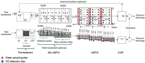 Schematic diagram of the studied full-scale hybrid system along with the sampling sites.
