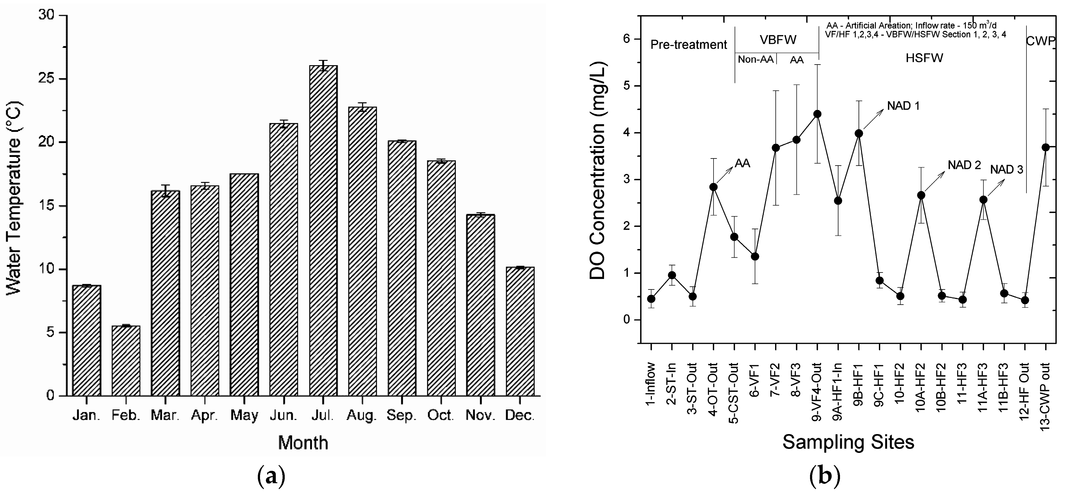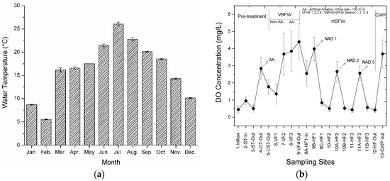 The water temperatures and dissolved oxygen (DO) levels in the studied hybrid system. (a) Average monthly water temperatures; (b) Annual average DO concentrations along with the flow routes of the investigated hybrid constructed wetland (CW).