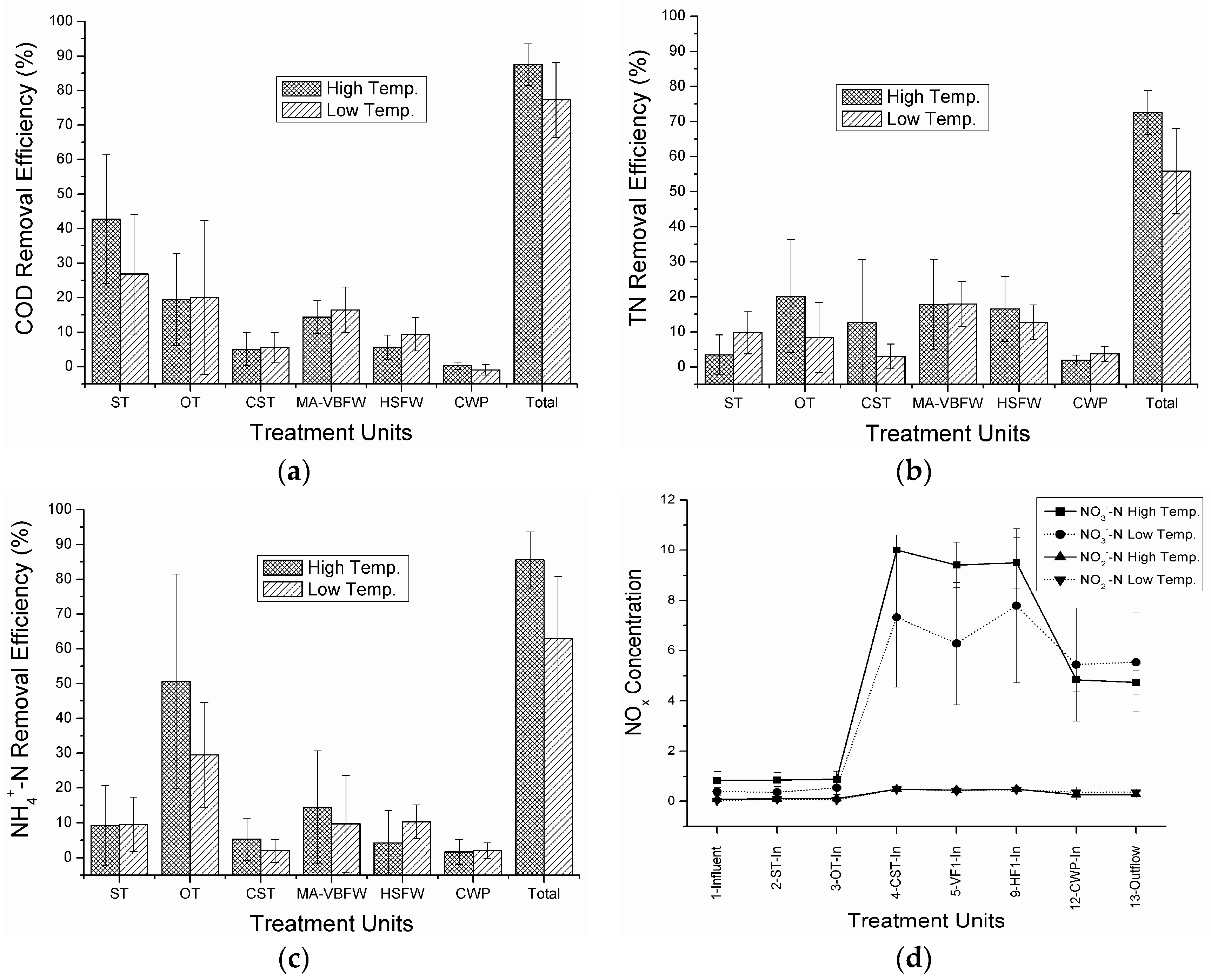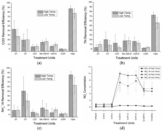 Seasonal variations of COD, TN, and NH4+-N removal efficiency and distributions of NOx (NO3−-N and NO2−-N) at different treatment stages of the studied hybrid system during summer and winter seasons is presented in Figure 3. The average concentration of inflow COD was almost similar during both seasons but total removal efficiency was significantly higher (p < 0.05) during summer (88% ± 6%) that in winter (77% ± 11%). The present COD removal efficiency during both seasons was much higher than the full-scale AA hybrid system reported by Pan et al. [7]. Compared with the other treatment stages, the first treatment stage (ST unit) contributed to the highest COD reduction during both seasons. The same phenomenon was also reported by the other researchers studied on hybrid systems that consisted of multiple treatment stages [30]. However, due to the high COD removal in ST unit during summer (43% ± 19%) in contrast with winter (27% ± 17%), total COD removal efficiency was significantly better during summer. Otherwise, COD removal rates in all treatment units showed similar performance during both seasons. In fact, in wetland beds (VBFW and HSFW), COD removal efficiencies were slightly higher during winter because of the low removal rate in pre-treatment stages.