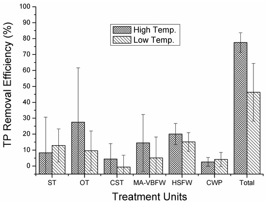The seasonal variations of TP removal efficiencies at different treatment stages are shown in Figure 4. Although the inflow TP concentrations were almost the same during both seasons, its removal efficiencies were significantly higher (p < 0.05) in summer periods (78% ± 6%) than those in winter periods (46% ± 18%). Compared with the other treatment units, the highest TP removal rates (28% ± 34%) were observed in the OT unit during summer; during winter, the HSFW unit showed the best removal rates (15% ± 6%) (Figure 4). The HSFW contributed more to TP removal than the VBFW throughout the experimental period. In summer, TP removal efficiencies at the OT and MA-VBFW stages were fluctuating because of the inflow variations in TP concentrations. However, final TP outflow concentrations were more stable in summer compared with those in winter. TP removal in CWs mainly refers to the physical processes such as substrate adsorption and chemical precipitation [2,4,5,10,27].