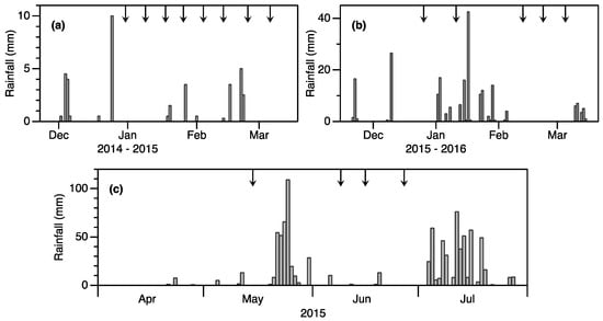 Daily rainfall at the experimental site over the three cropping seasons: (a) November 2014 to March 2015; (b) November 2015 to March 2016; (c) April to July 2015. Arrows at the top indicate the time of irrigation application (from V6 growth stage) for all treatments.