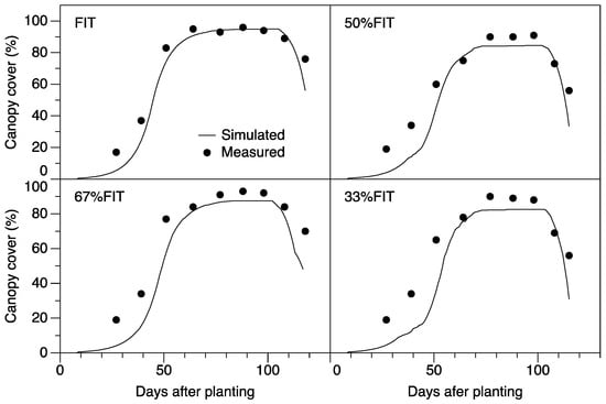 Simulated and measured canopy cover for the four irrigation treatments in Experiment 1 used in model validation.
