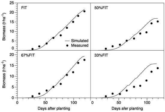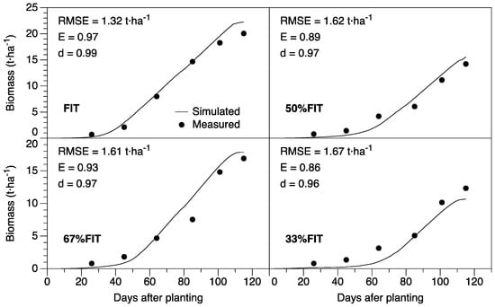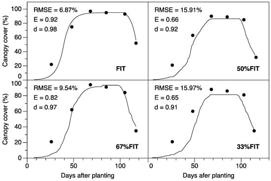 Seasonal evolution of measured and simulated aboveground biomass is depicted in Figure 3. Generally, there is a good fit of measured and simulated values for the FIT, as indicated by the low RMSE and high d and E given in Table 4. The model was also able to simulate reasonably well the biomass production for deficit treatments 67% FIT and 50% FIT, as reflected by the statistical parameters. In general, however, the model tended to overestimate the biomass accumulated, with the deviation becoming more distinct in the DI treatments, especially 33% FIT (Figure 3). This treatment was observed to experience more severe water stress, an onset that began during the vegetative growth stage. The water stress experienced by the 33% FIT resulted in a model efficiency of 0.43, indicating that as water stress intensifies model reliability lessens. During the calibration stage, while the seasonal evolution of CC was generally underestimated the biomass was overestimated.