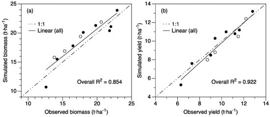Relation between measured and simulated values for (a) biomass and (b) grain yield for the calibration dataset (open circle) and validation dataset (filled circle).