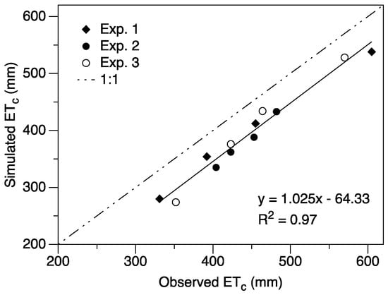 Comparison between measured and simulated seasonal evapotranspiration (ETc) for all treatments over the three experimental (Exp.) periods.