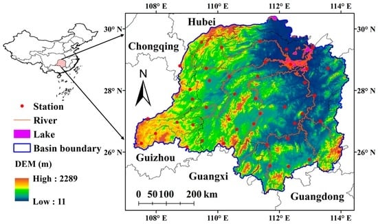The Dongting Lake Basin (DTLB) is situated in the middle reach of the Yangtze River (approximately 24°38′ N–30°26′ N, 107°16′ E–114°17′ E) [33]. Within which the Dongting Lake is the second largest freshwater lake in China, and is also one of the most important international wetlands [33]. The lake is fed by four other major rivers, namely the Xiangjiang River, Zishui River, Yuanjiang River and Lishui River (Figure 1). The total area of DTLB is about 2.62 × 105 km2, and occupies about 14% of the Yangtze River Basin. This region has a subtropical monsoon climate, jointly influenced by the southeast monsoon, southwest monsoon, subtropical anticyclone and the westerly. The wet season in DTLB is between July and September while the dry season is between November and the next February. The topography in this basin is relatively complex (Figure 1), with mountains located in the eastern, southern and western parts, and low hills and flatlands in the central and northern part (Figure 1).