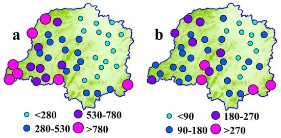 As shown in Figure 2, the four precipitation indices had different changing patterns and spatial distribution in the four seasons. In particular, the R (seasonal total precipitation) exhibited descend trends at almost all the stations (about 93%) in spring and in autumn, and upward trends in summer and winter (Figure 2a–d). The Ri decreased in the central part of the DTLB and increased in other parts in spring, and showed uptrends in summer, autumn and winter (Figure 2e–h). While the Rx1 and Rx5 had generally the same changing patterns in summer, autumn and winter (Figure 2j–l,n–p), and differed slightly in spring. Particularly, the Rx1 and Rx5 increased in summer, autumn and winter in major part of the basin; whereas in spring, the Rx1 decreased in the central part and increased in the south and north part (Figure 2i), while the Rx5 had general tendencies to decline except at few stations located in the southeastern mountainous regions (Figure 2m).