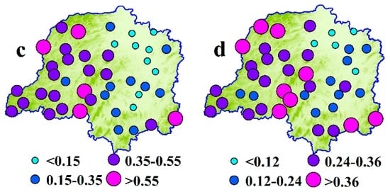 The results showed that the selected precipitation indices at most of the stations generally had insignificant changing trends in the four seasons (Figure 2) [29,31]. However, the direction of the trends differed in different seasons. At the regional scale, the R, Rx1 and Rx5 decreased in spring and autumn, and increased in summer and winter, while the Ri exhibited upward trends in all the seasons. These results were consistent with other regions in China [46]. Together with the facts that the annual precipitation amount decreased in the same decades, the results above indicate that the precipitation would have tended to concentrate in summer and winter, especially in summer. Furthermore, the trends of the Rx1 and Rx5 in winter were 0.97 mm∙days−1∙decade−1 and 2.30 mm∙(5·days)−1∙decade−1, respectively, being generally higher than those (absolute value) in other seasons, implying that extreme precipitation events in winter were enhanced more significantly.