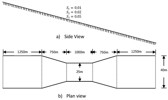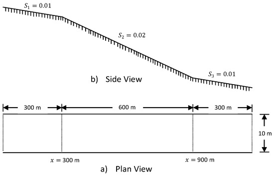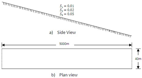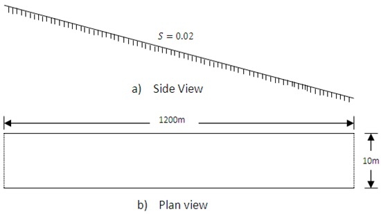 As shown in Figure 6, a hypothetical prismatic channel 1200 m in length and 10 m in width was used for this test. The channel has a constant bed slope of . The channel bed was made horizontal across the channel width. Therefore, the flow in that direction is insignificant.