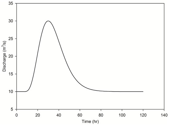 A discharge hydrograph shown in Figure 2 was used as upstream boundary condition for all methods. The hydrograph has a peak of 30 m3/s, base flow of 10 m3/s and base period of 5 days. The downstream boundary condition used was a water depth based on uniform flow conditions, which was defined by the bottom slope and Manning’s .